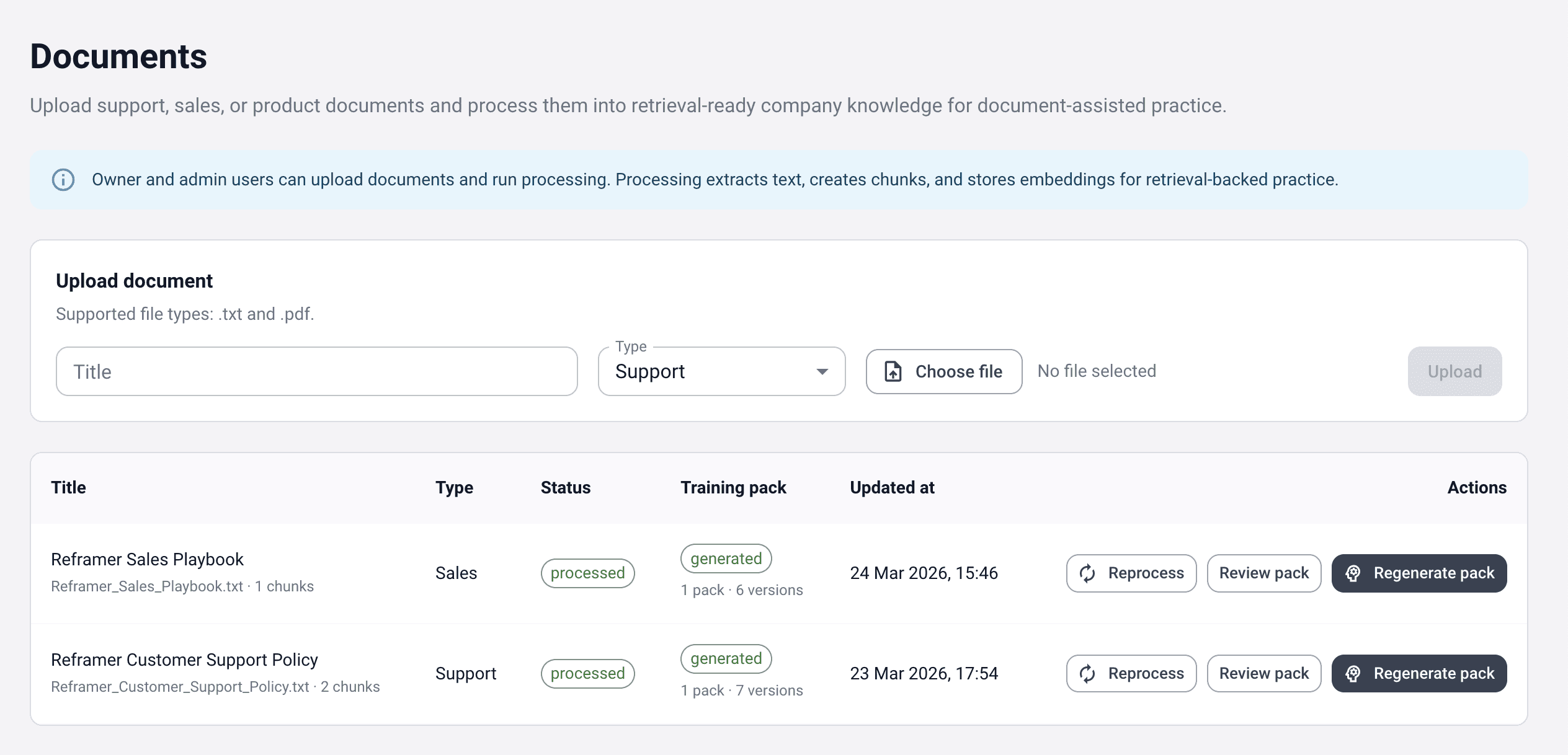 Reframer turns your product docs, support guides, and sales playbooks into real conversation scenarios your team can